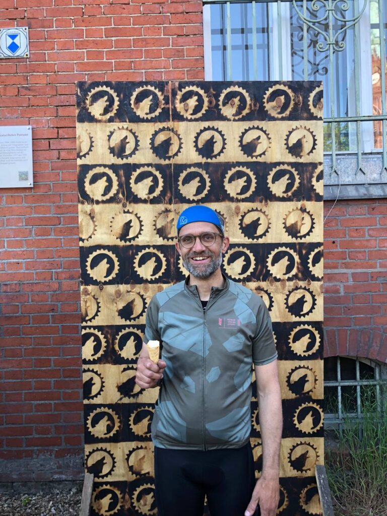 Als wir dann in Bernau einrollen und eine kleine Ehrenrunde durch die Altstadt drehen überwältigen mich meine Gefühle. Irre es wieder hierher geschafft zu haben. In der alten Post erwarten uns sogar ein Eis und kühle Getränke. Außerdem ein paar Mitfahrende, die ich unterwegs schon kennen gelernt habe. Ich bin überglücklich. Ein Foto noch vor der wunderschönen Steppenwolf-Wand muss auf jeden Fall sein.
