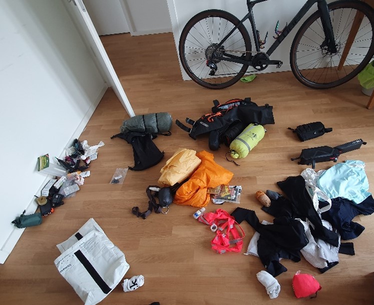 Ich könnte jetzt auch von den Wochen der Vorbereitung vor dem Event schreiben, wie ich mein Setup getestet und meine Packliste verfasst habe – tu ich nicht, habe ich nämlich nicht gemacht. Man hat ja auch ein Leben neben dem Radfahren und Radfahren neben dem Steppenwolf. Als ich den Tag vorher allerdings die ganzen Posts auf Instagram sehe, von Mitfahrenden, die fein säuberlich all ihre (gut getestete) Ausrüstung nebeneinander aufgereiht haben, bekomme ich doch ein bisschen Muffensausen. Ich habe nicht einmal getestet, ob all mein Kram überhaupt in meine Taschen passt. Gestern noch habe ich mir ein Zelt und eine Lenkerrolle ausgeliehen. Hier also ein ehrliches Foto meiner Packsession am späten Nachmittag vor dem Tag der Abreise: